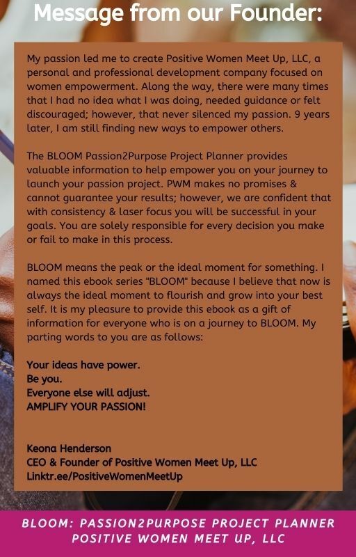 The Passion2Purpose Project Planner is for creatives who have amazing ideas, but don't know how to execute them. This downloadable planner will guide you with self-care tips, worksheets and personal and professional development activities that will help you identify, clarify and amplify your passion project. Print it and most importantly, USE IT!