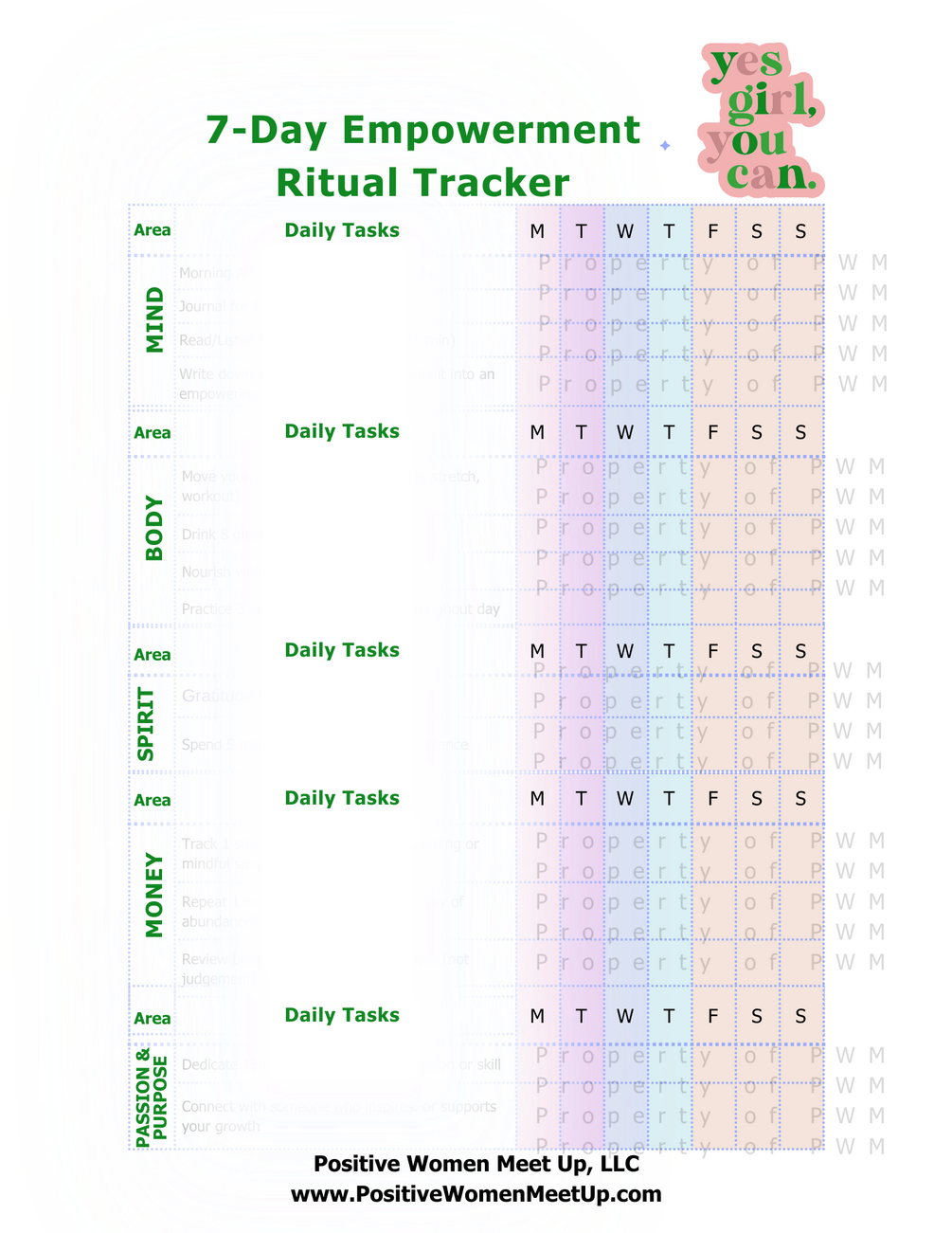A 1 page digital download - 7 day empowerment ritual tracker with 5 categories